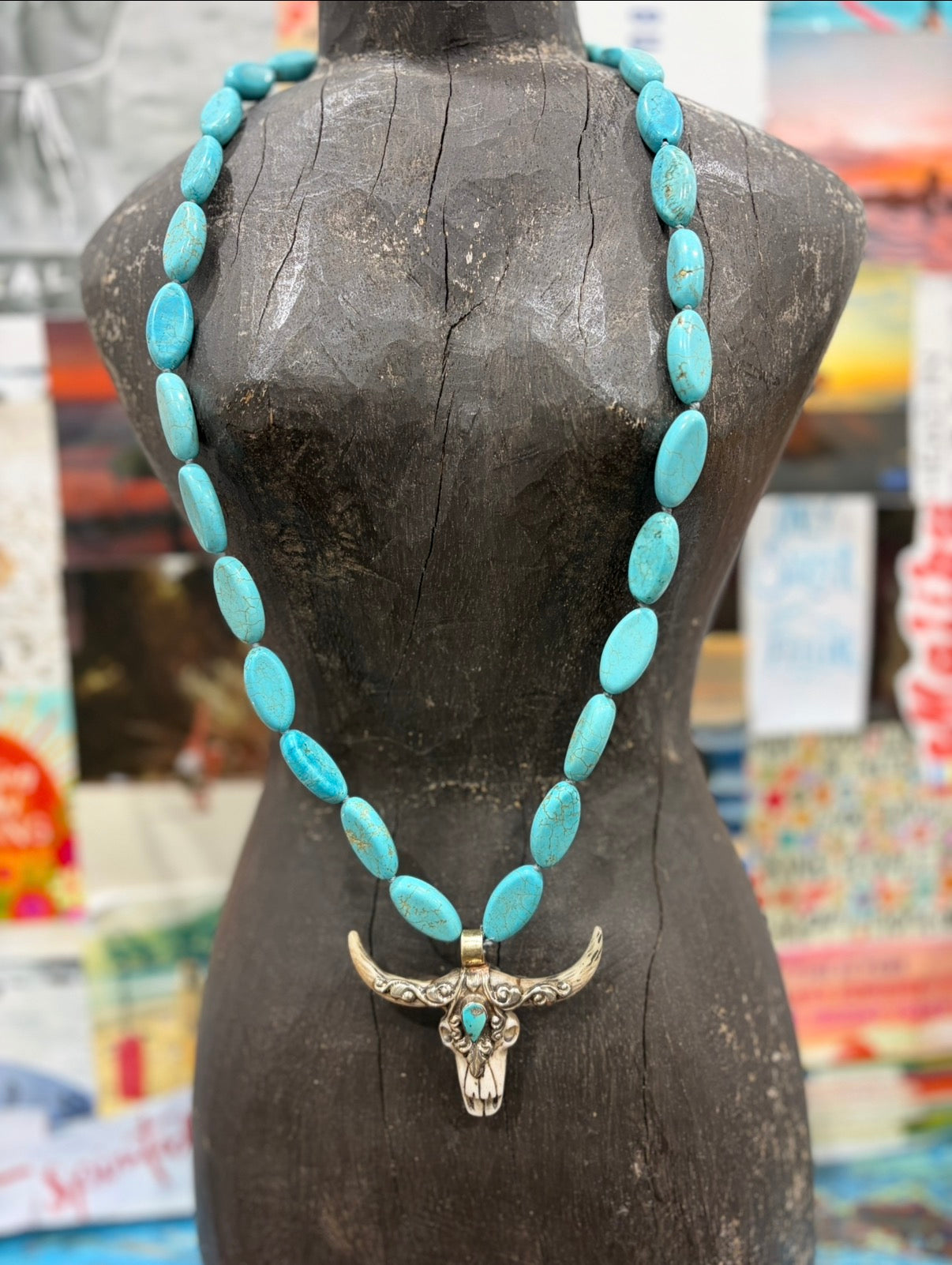 MALIBU HIPPIE Howlite Tibetan Silver Carved Tusk Steer Head w/Turquoise OOAK Necklace