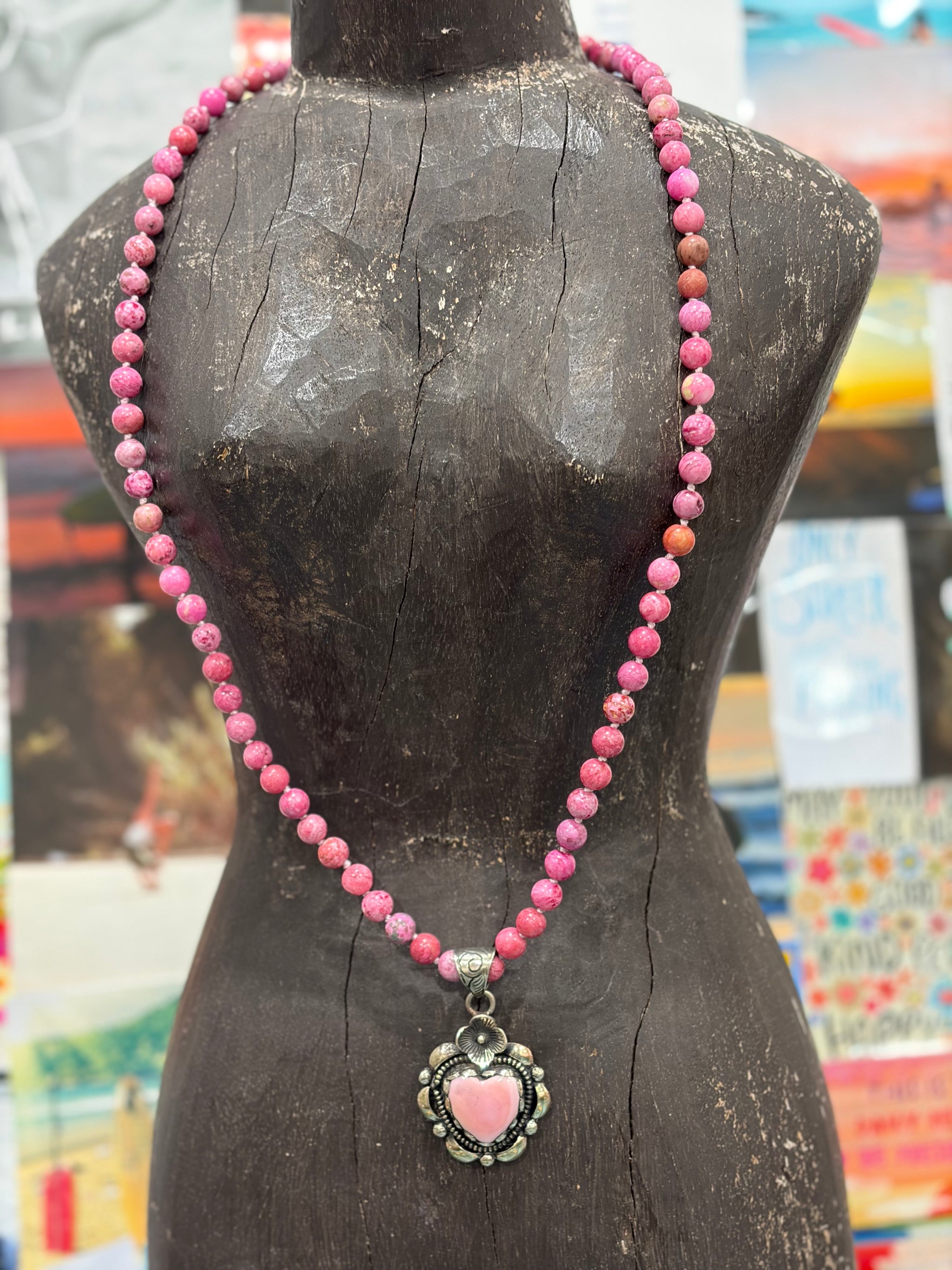 One of a Kind Sea Sediment beads adorn with a Tibetan Silver encased Conch Shell Heart.