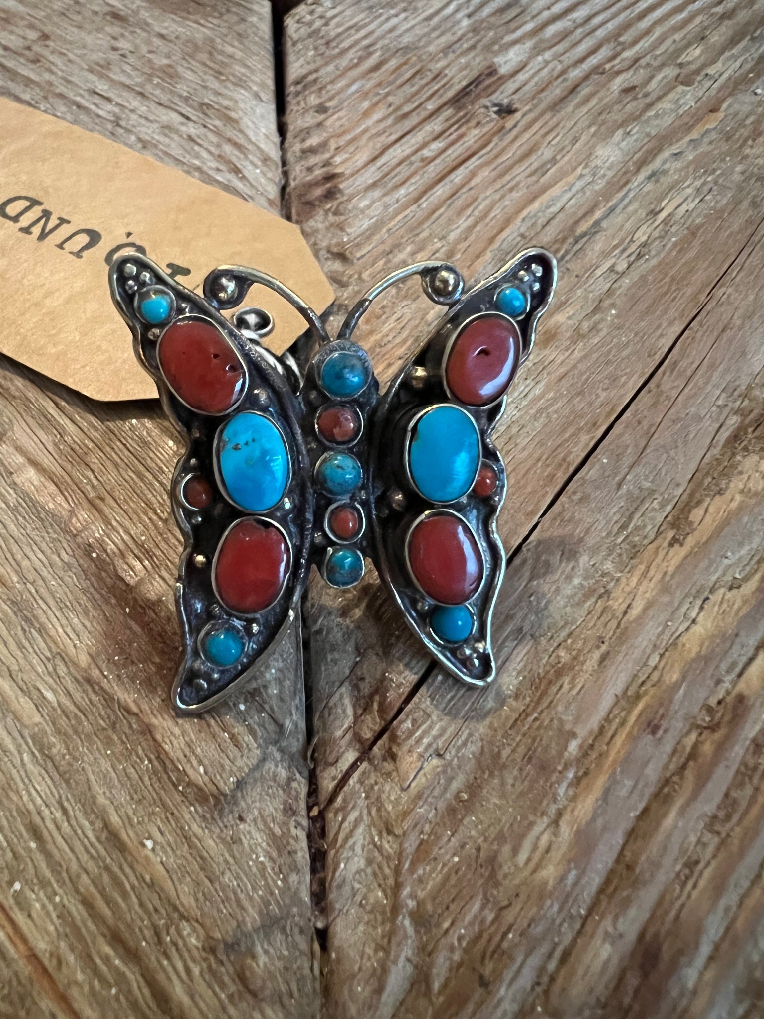 German Silver Italian Coral Turquoise Butterfly Ring - Size 7