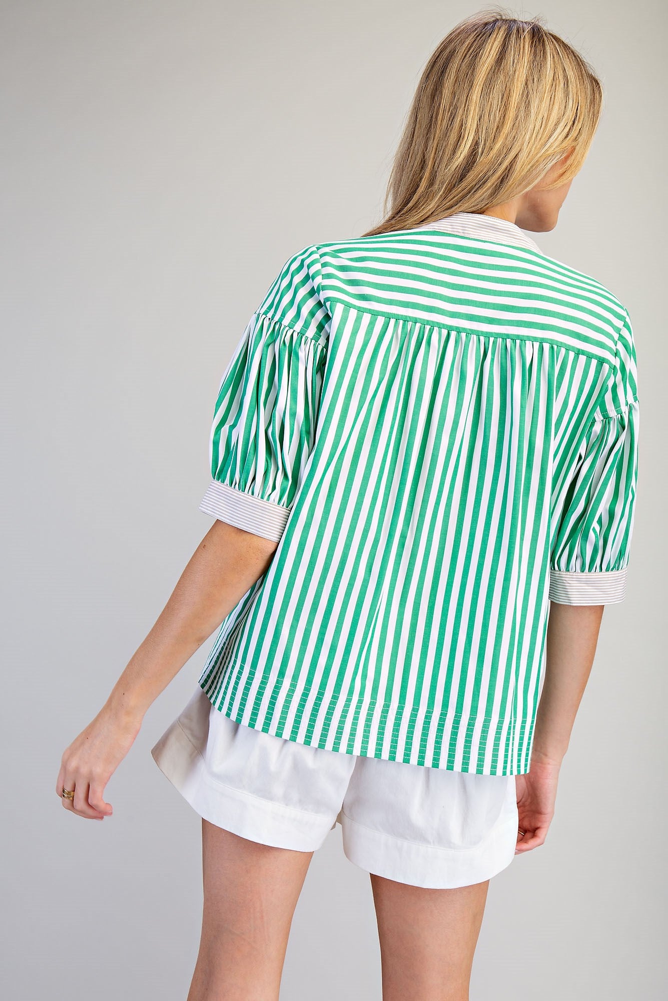 This striped blouse features a split neckline with contrast trim, gathered yoke detailing, voluminous elbow length puff sleeves with cuffed hems, and a relaxed silhouette for a polished yet airy look.
