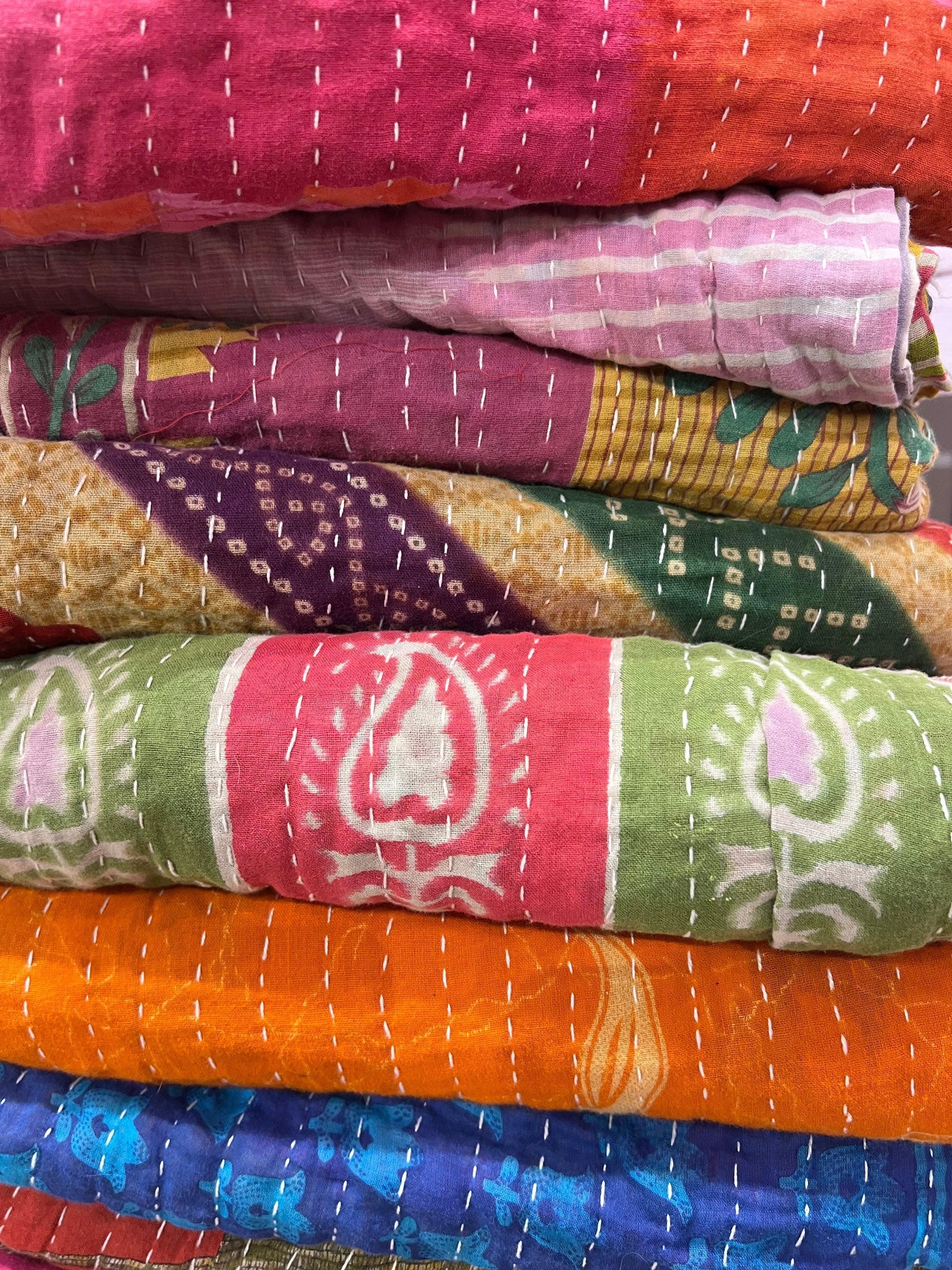 Beautiful One of a Kind Kantha blankets made of recycled Sari fabrics from India.