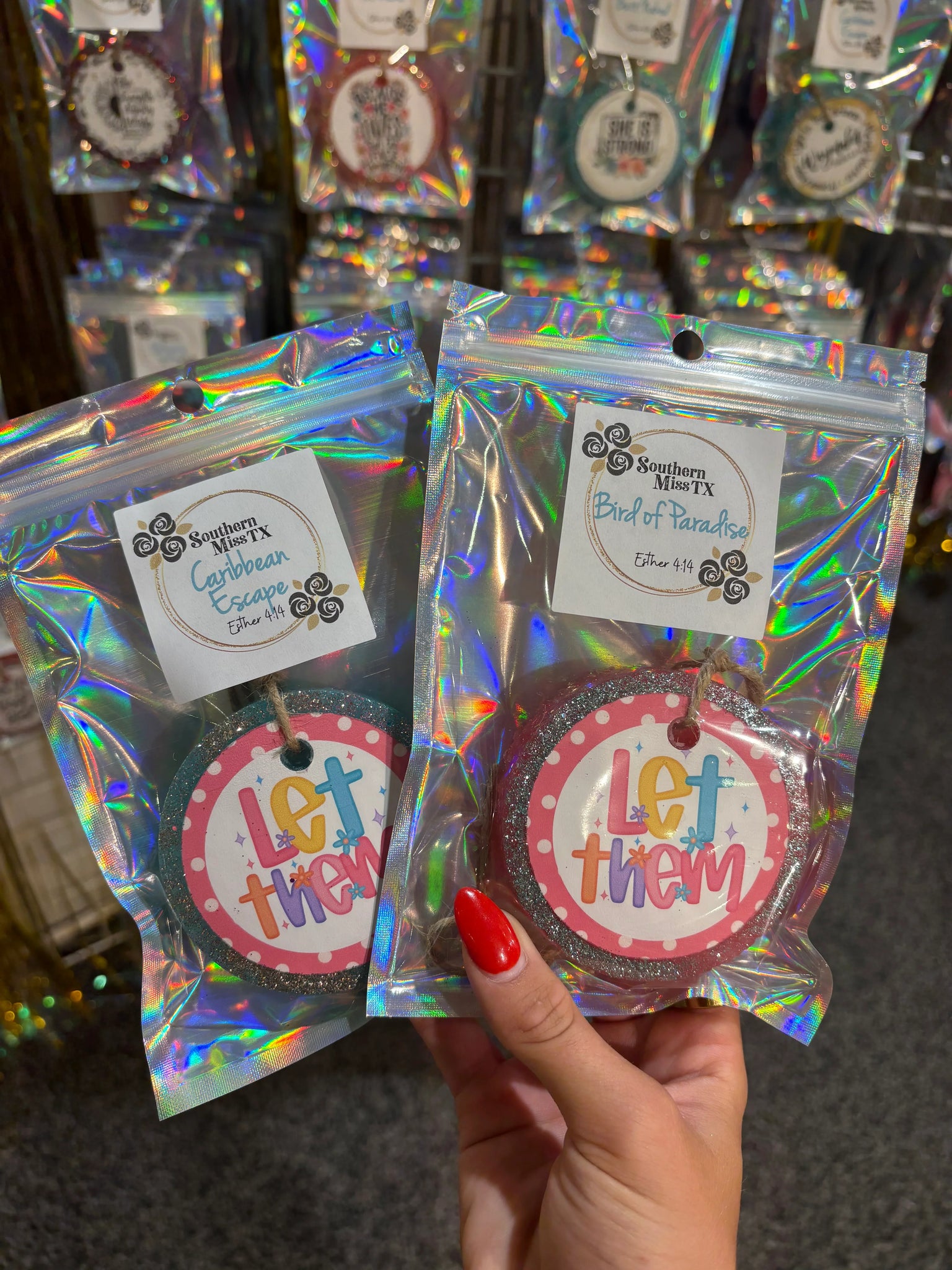 Hang from your rear view mirror to get your car smelling fabulous! You can also hang in closets or in bathrooms. The scent will last for 1-2 months!